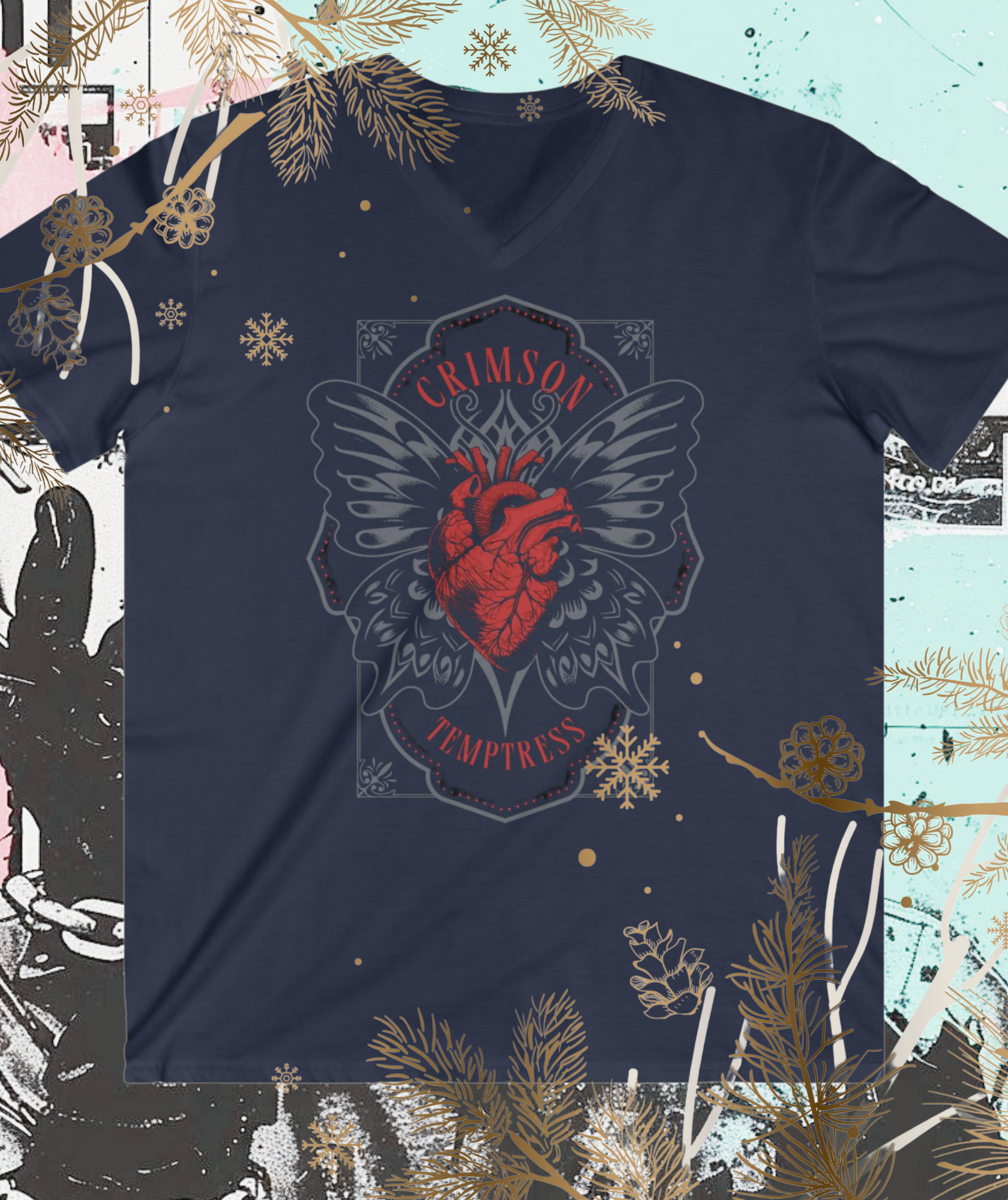A slim, semi-fitted V-neck tee that carries a bold, hand-inked vibe — a red anatomical heart with winged embellishments and gothic lettering sits at the chest like a talisman. Lightweight cotton feels cool against the skin and the ribbed collar keeps the neckline sharp after many wears. This shirt moves easily from late-night shows to city streets; it layers well under a worn denim jacket or stands alone with worn-in jeans. The artwork reads like an old tattoo flash revived for everyday wear — intimate, a little rebellious, and quietly confident.