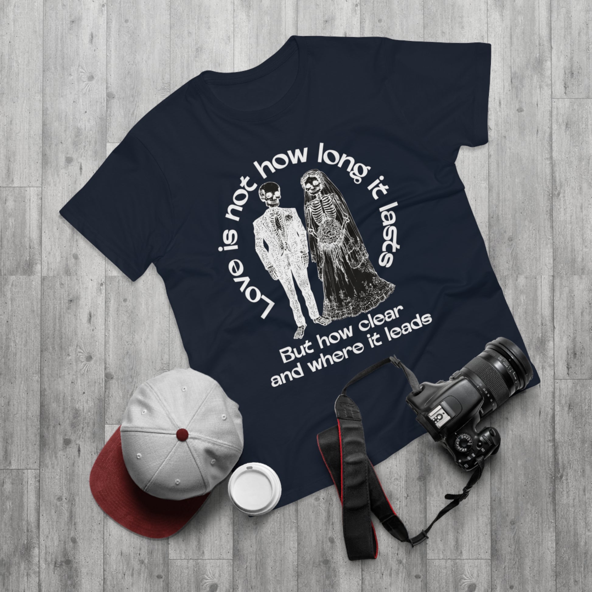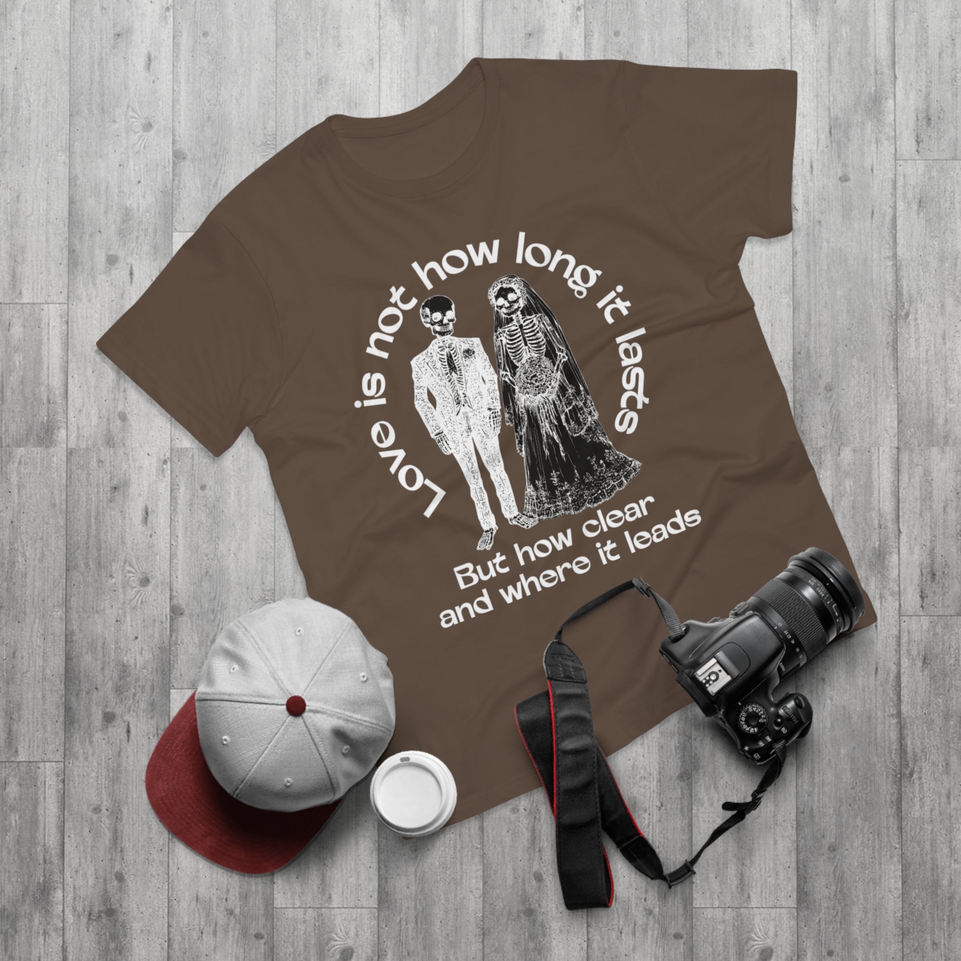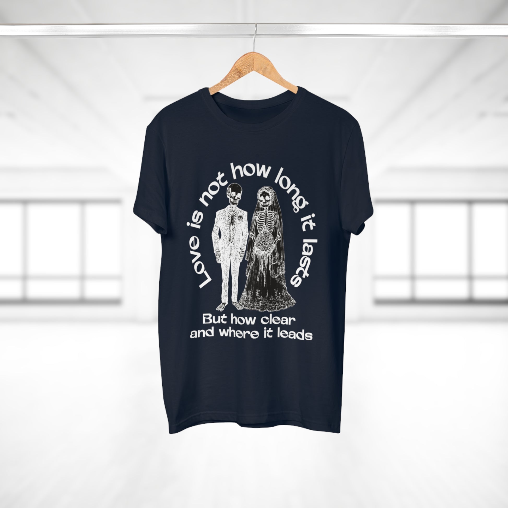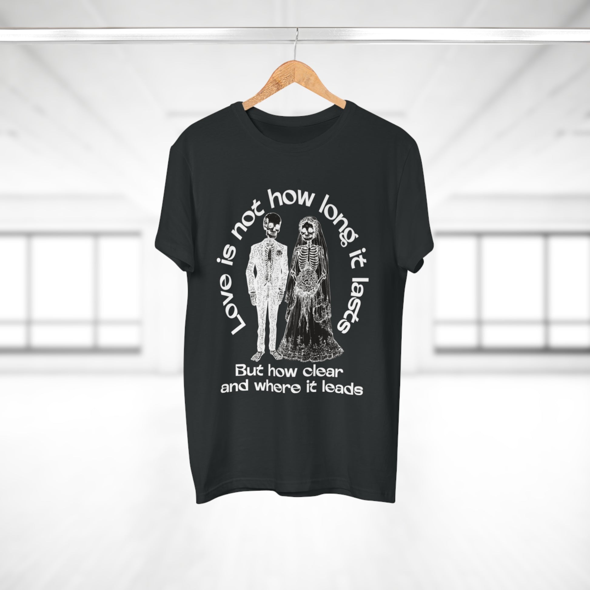 A lightweight, regular-fit cotton tee with a dark, moody design that reads like a line from a melancholic poem. The front shows a vintage-style skeletal couple beneath the phrase “Love is not how long it lasts / But how clear and where it leads,” creating a quietly rebellious, reflective vibe. Wear it layered under a worn denim jacket or alone with slim jeans to make a subtle statement—this shirt speaks to late-night conversations, slow drives, and people who appreciate bittersweet sentiments turned into artful clothing. The soft combed ringspun cotton and clean ribbed collar keep the silhouette simple and comfortable so the message takes center stage.
