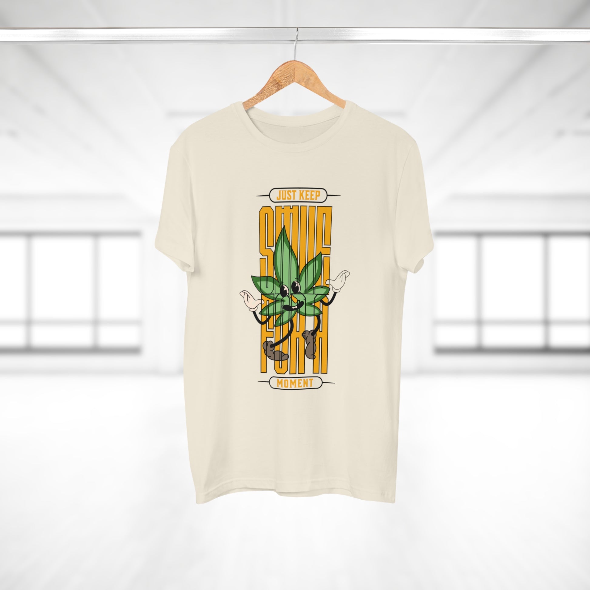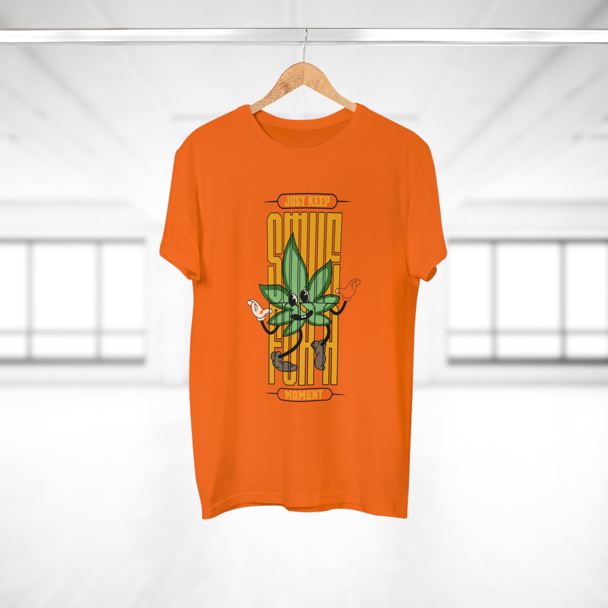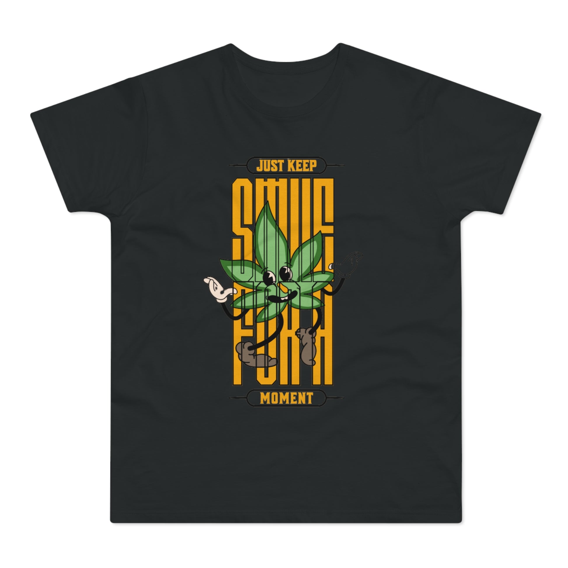 Breathe easy and smile in this lightweight, regular-fit tee built for relaxed days and playful vibes. The shirt features a bold, retro-inspired graphic of a cheerful cannabis leaf framed by warm, sunset-yellow lettering that reads “Just Keep Smiling Moment.” Soft, combed ring-spun cotton (with heather blends where noted) keeps the fabric breathable and gentle against skin. The tubular knit construction and ribbed collar hold shape through repeated wear, while the twill neck tape adds comfort and reduces stretching. Wear it on chill afternoons, casual meetups, or laid-back festival nights — it brings a bright, cheeky energy without taking itself too seriously.