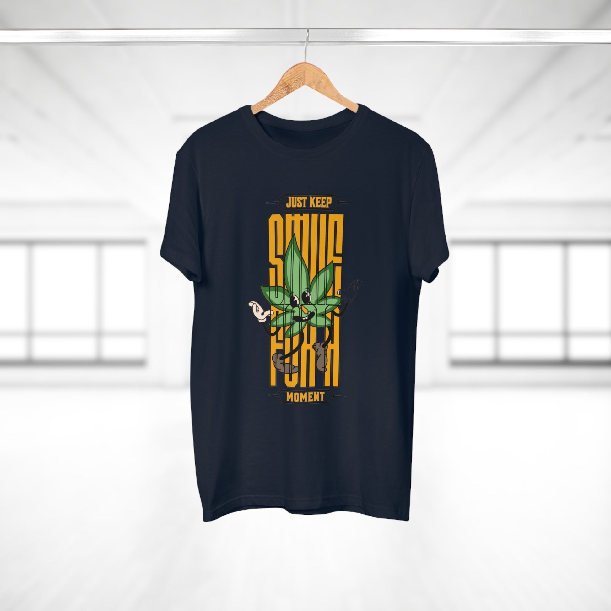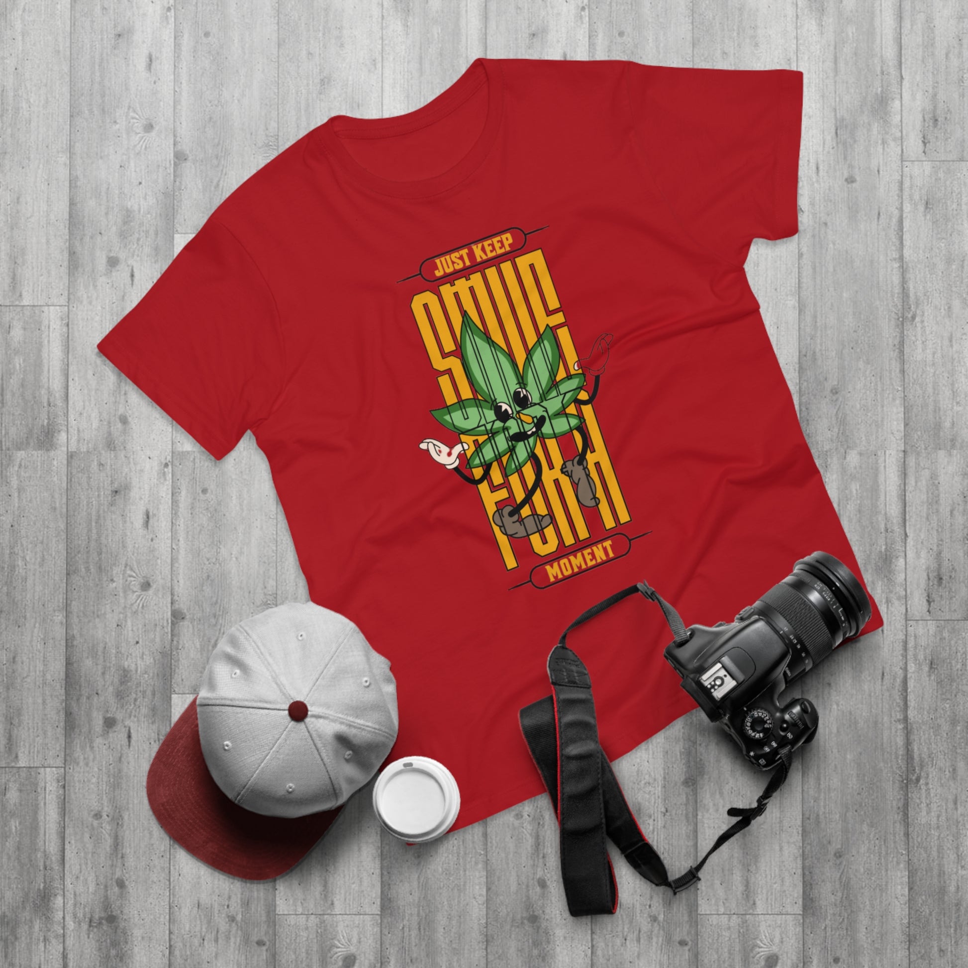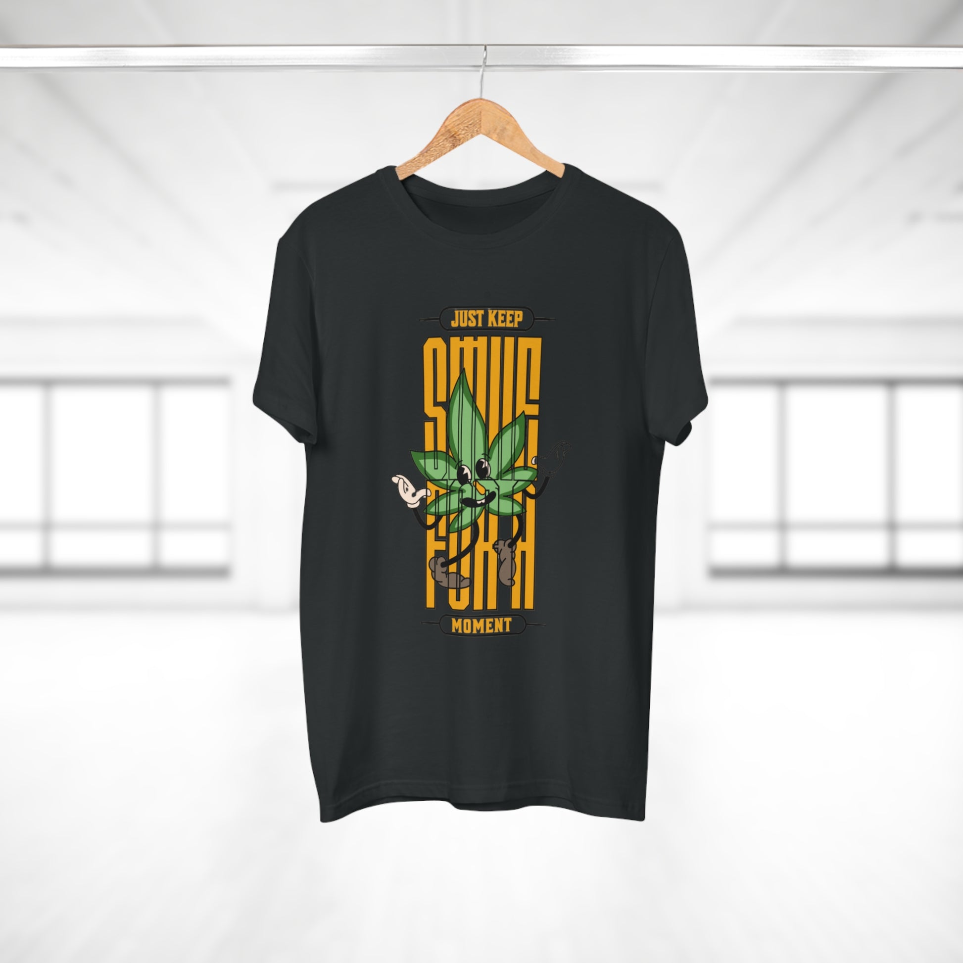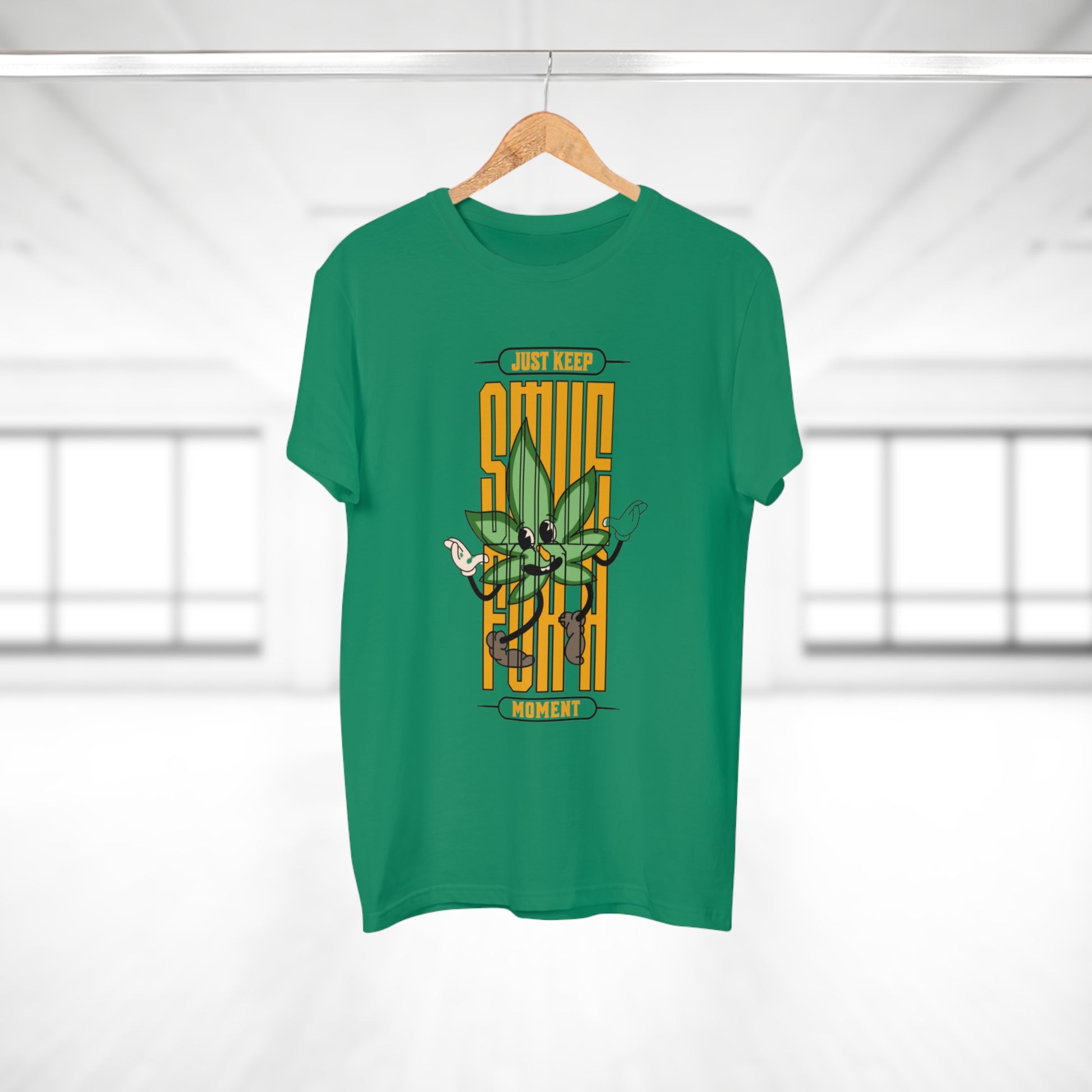 Breathe easy and smile in this lightweight, regular-fit tee built for relaxed days and playful vibes. The shirt features a bold, retro-inspired graphic of a cheerful cannabis leaf framed by warm, sunset-yellow lettering that reads “Just Keep Smiling Moment.” Soft, combed ring-spun cotton (with heather blends where noted) keeps the fabric breathable and gentle against skin. The tubular knit construction and ribbed collar hold shape through repeated wear, while the twill neck tape adds comfort and reduces stretching. Wear it on chill afternoons, casual meetups, or laid-back festival nights — it brings a bright, cheeky energy without taking itself too seriously.