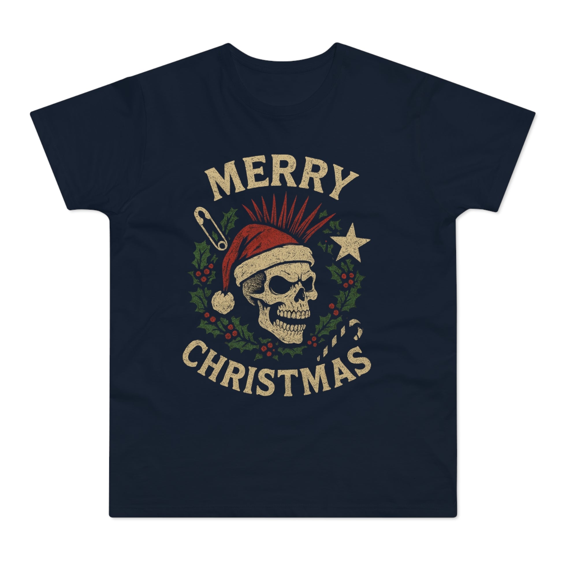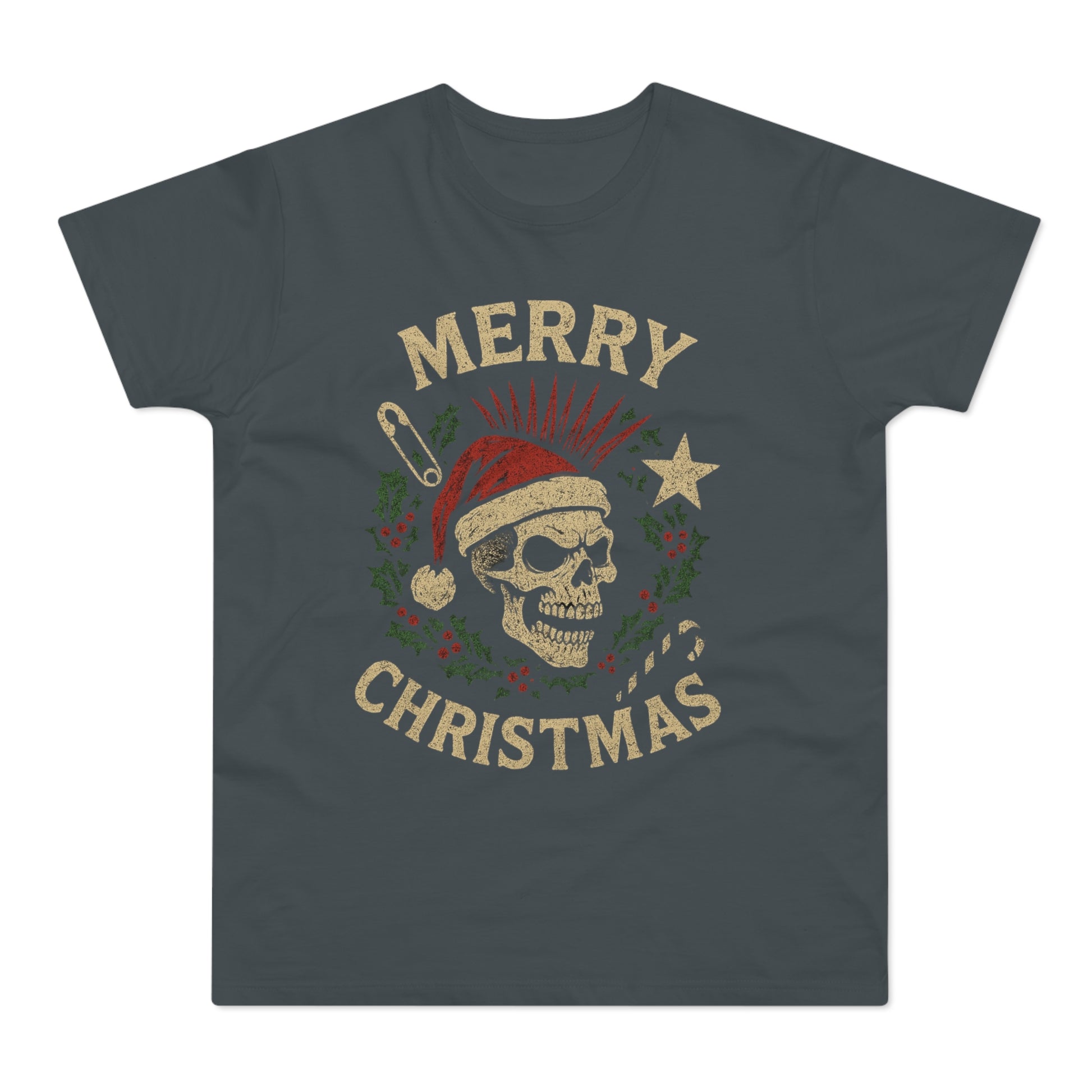 This rugged, lightweight tee blends old-school punk attitude with holiday mischief. A distressed skull wears a Santa hat amid candy-cane bones, stars and holly — it reads “Merry Christmas” with a faded, vintage print that looks like it’s been through many seasons. The regular-fit cut and soft combed ringspun cotton make it breathable and easy to layer under jackets or wear solo at concerts, gatherings, or low-key holiday hangouts. It’s for people who like their festivities a little rough around the edges — equal parts nostalgic and rebellious, with a comfortable, lived-in feel from day one.